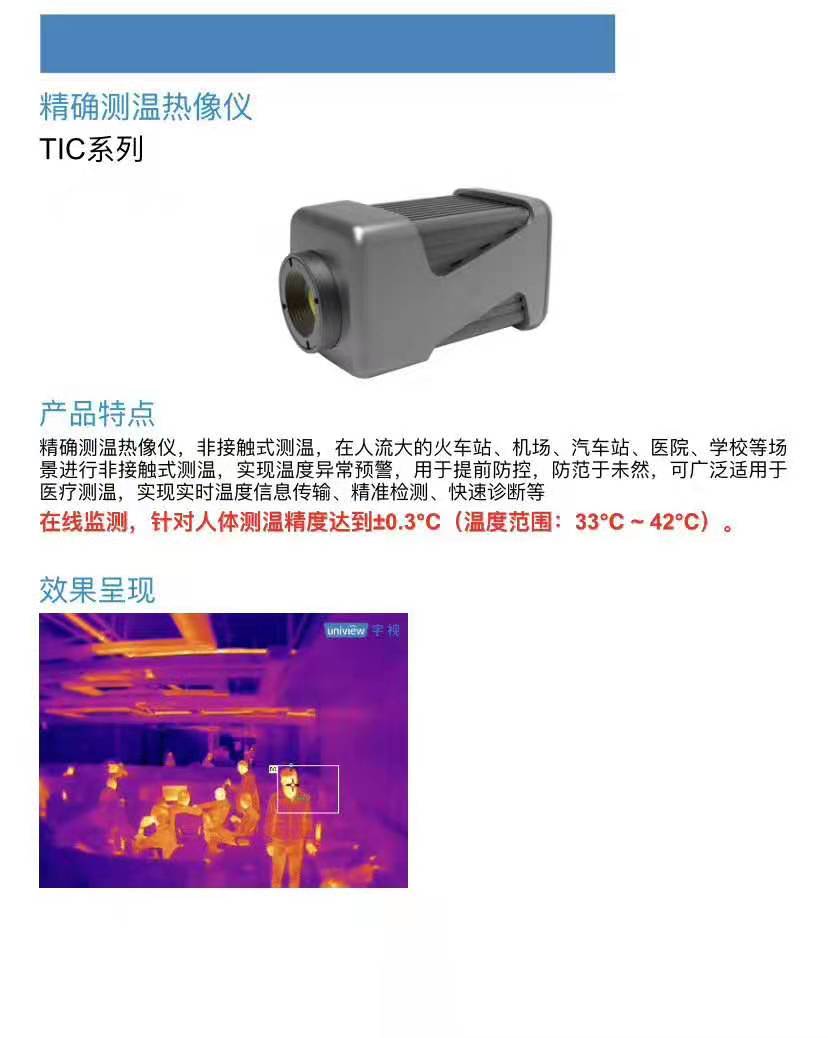 联系电话:18606282168(微信同号) 1:进出人员体温非接触方式快速检测,检测测温精度±0.3℃; 2:可设定探测区域,支持点、线、框测温 3:可设置告警温度阈值,超过阈值即告警 4:探测距离为2米,即设备距离目标距离为2米时可精确测温 5:探测覆盖宽度,TIC300的探测宽度为1米(13mm),TIC600的探测宽度为2米。