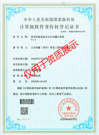 3): 医学实验室标本全自动灌注系统V1.0:证书登记号2020SR1181497;