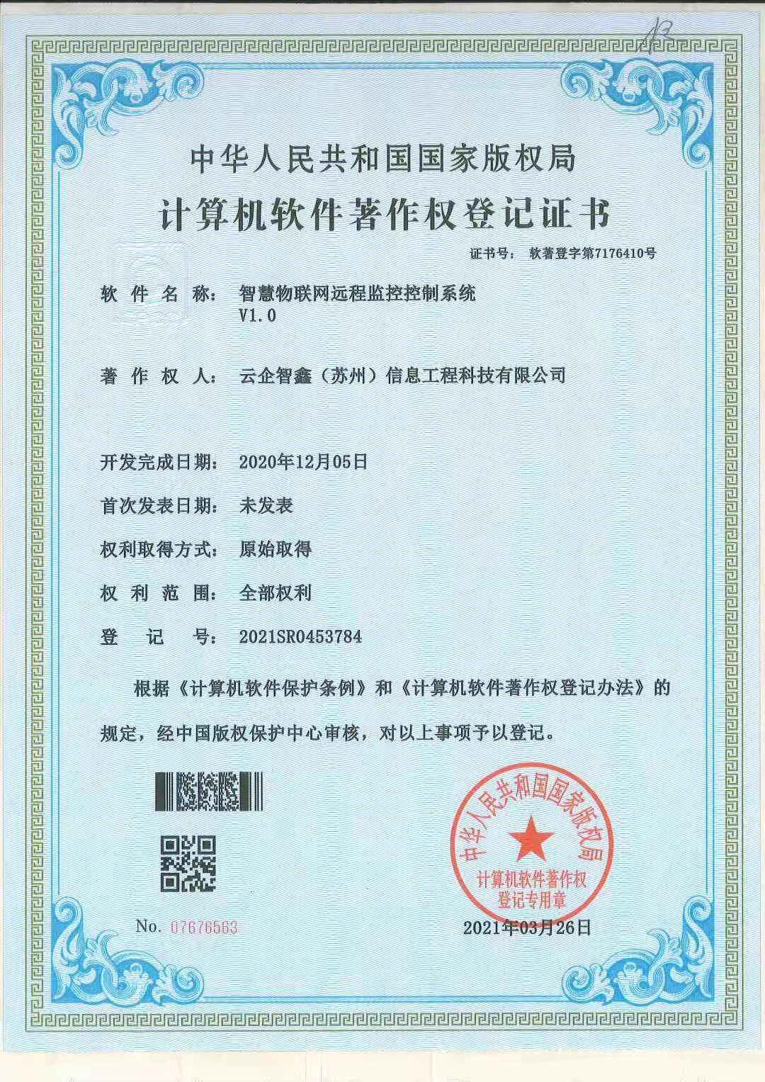 5):智慧物联网远程监控控制系统V1.0:证书号2021R11L1246918;